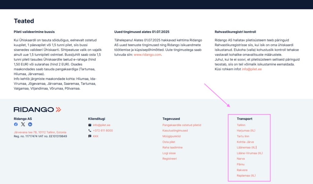 - URL: Sisestades pilet.ee URL väljale avaneb kohe veebileht maakonnad.pilet.ee, mille URL on edaspidi pilet.ee. Ridango teeb nii, et antud veebileht avaneks ka URL-iga maakonnad.pilet.ee. Ehk siis mõlemad URL-id avavad pilet.ee lehte.